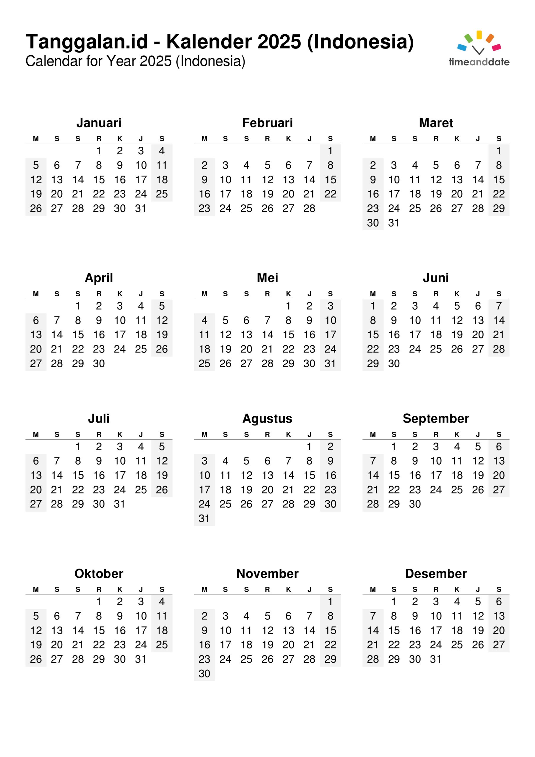 Kalender 2025 ini lengkap dengan tanggal merah dan daftar hari libur nasional Indonesia, cuti bersama, serta kalender Jawa dan Hijriyah.