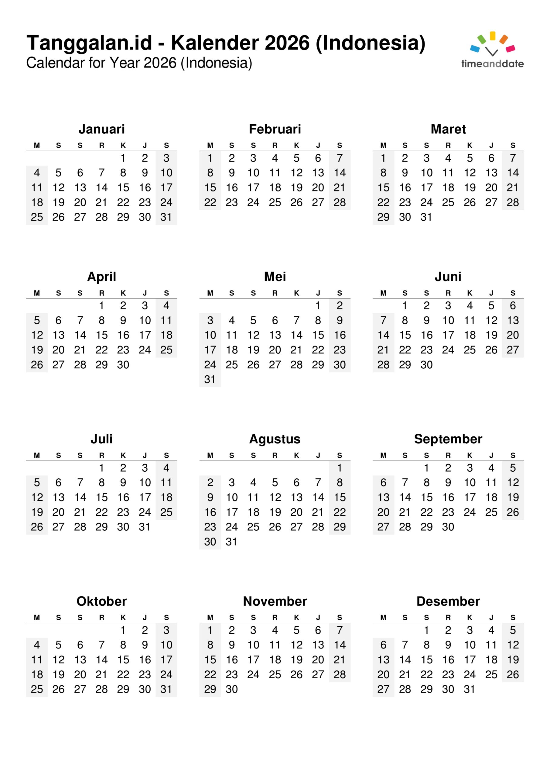 Pilih bulan melalui daftar di atas untuk melihat kalender detail setiap bulan dari Januari sampai Desember 2026.